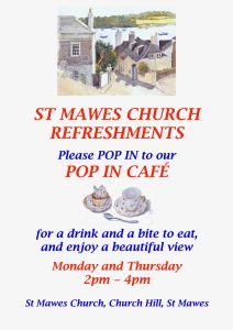 Parish Coffee Morning: the monthly coffee morning will be held at Sunnybanks, Trelawney Road, St Mawes on Saturday 16th September from 10 am – 12 noon. Do come along for a cuppa and a cake!